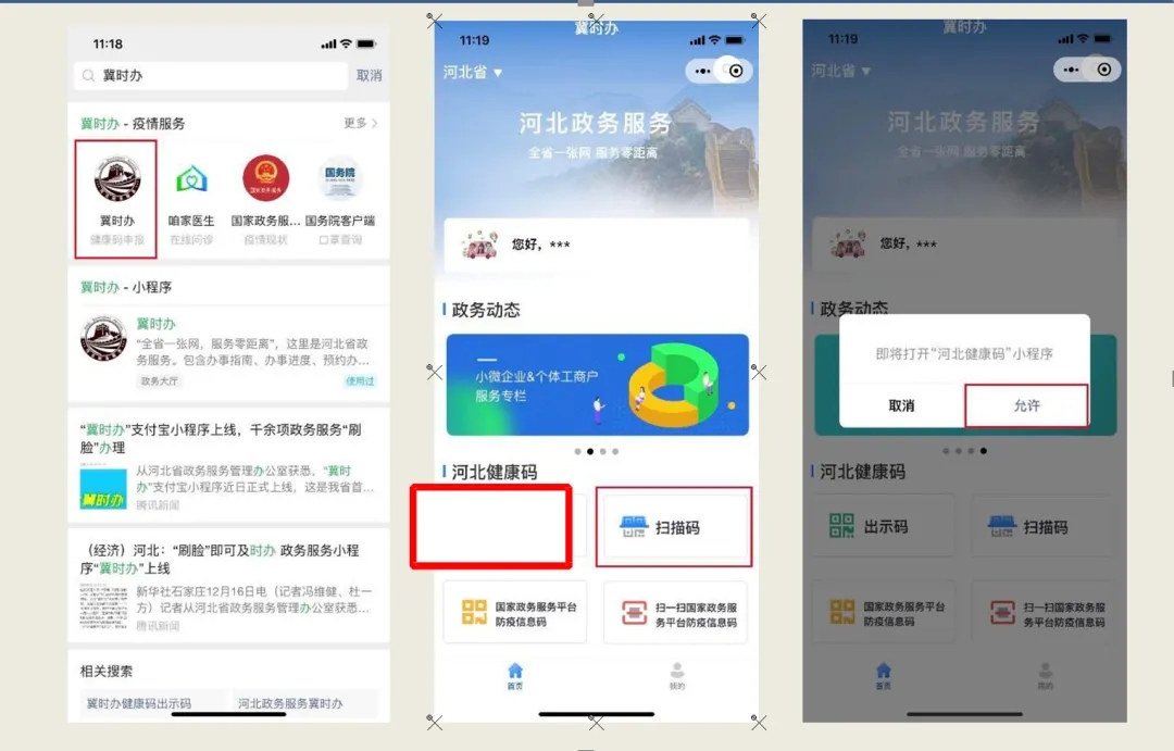 微信搜索“冀时办”→打开“冀时办”小程序→初次使用,需先登录→实名认证→点击“出示码”按钮→初次使用时,进行一次健康申报(去打卡)→亮出本人“健康码”或被动扫码→查看个人健康信息→如果提示“未见异常”可以通行→如果有红色“提示信 息”,要进行健康状态核验。