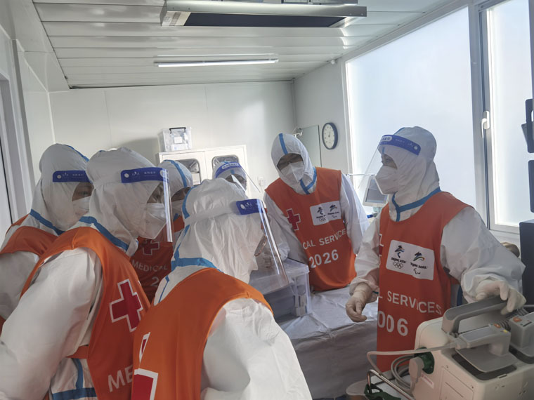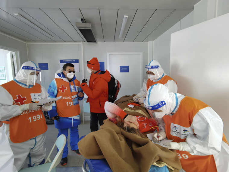 当穿越疫情的阻隔,全世界的目光聚焦在赛场时,疫情防控线是每位冬奥医疗保障队员必须坚守的底线,也是本次医疗保障任务的重要一环。为了增强冬奥会的疫情防控能力,我院在赛前派出经验丰富的院感专家对冬奥医疗保障队全体成员进行多次疫情防控知识、穿脱防护用品操作培训、考核和疫情防控流程梳理。每一位队员在医疗保障期间都严格遵守场馆疫情防控规定,根据工作和居住场所特点完善疫情防控措施,着规定防护等级服装进入工作岗位,要求医疗保障队每位成员都做疫情防控的第一责任人,确保平安完成冬奥医疗保障任务。