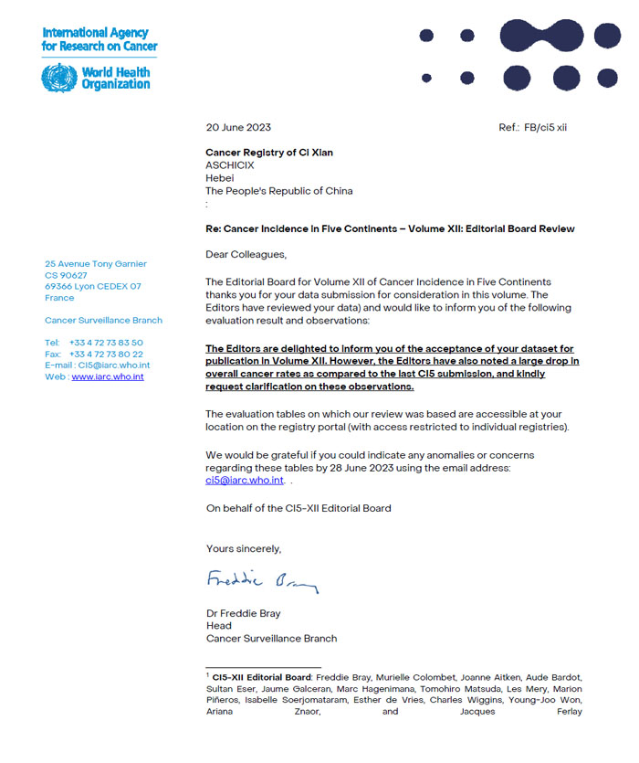 日前,2022年河北省肿瘤防治办公室(设立于我院)向国家癌症中心提交的河北省14个肿瘤登记处2013-2017年肿瘤发病数据,被国际癌症研究机构(IARC)出版的专著《五大洲癌症发病率》第12卷收录。本次共收录中国156个肿瘤登记处的数据,我省也成为全国第三大被收录省份,创造了河北省肿瘤登记工作新的里程碑。