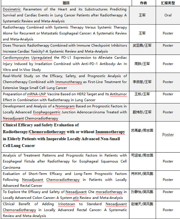 我院放疗科王军教授作为学科带头人,带领各位主任和其团队提交的多项研究凭借创新性和临床价值获得大会高度认可。其中,题为《Dosimetric Parameters of the Heart and its Substructures Predicting Survival and Cardiac Events in Lung Cancer Patients after Radiotherapy: A Systematic Review and Meta-Analysis》的口头报告,从全球数千份投稿中脱颖而出,向国际同行展示了我院在肿瘤精准放疗领域—放射性心脏损伤方面的重要进展。16项壁报展示则分别从放疗与系统治疗最佳联合时机及模式、联合治疗毒性管理、生物标志物探索、综合治疗策略等角度,系统呈现了我院在食管癌、肺癌等领域的长期临床积累与技术储备。