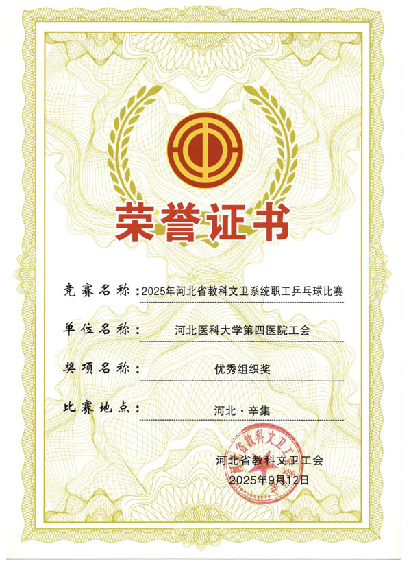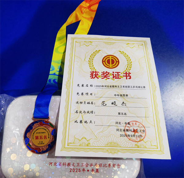 9月9-12日,2025年河北省教科文卫系统职工乒乓球比赛在辛集举办,赛事由省教科文卫工会主办、辛集市总工会承办。我院工会积极组织、精心筹备职工参赛,荣获“优秀组织奖”;骨科范晓杰在中年男子组单打项目中位列第五名。