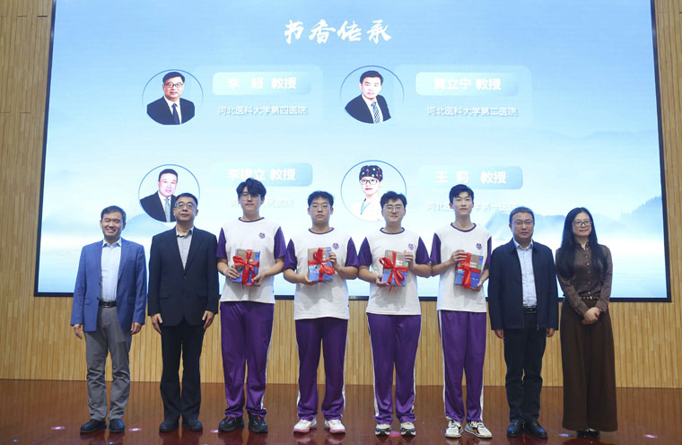 活动现场还举行了“致敬榜样”仪式,学子为专家颁发“育人楷模”奖杯并献花,感谢他们深耕教育、倾囊相授的奉献精神。我院麻醉二科主任李超、河北医科大学第二医院麻醉科主任黄立宁、河北省人民医院副院长李建立、河北医科大学第一医院麻醉科主任王莉为学生代表授书,寄语青年学子“赓续医学薪火,传承书香文脉”。